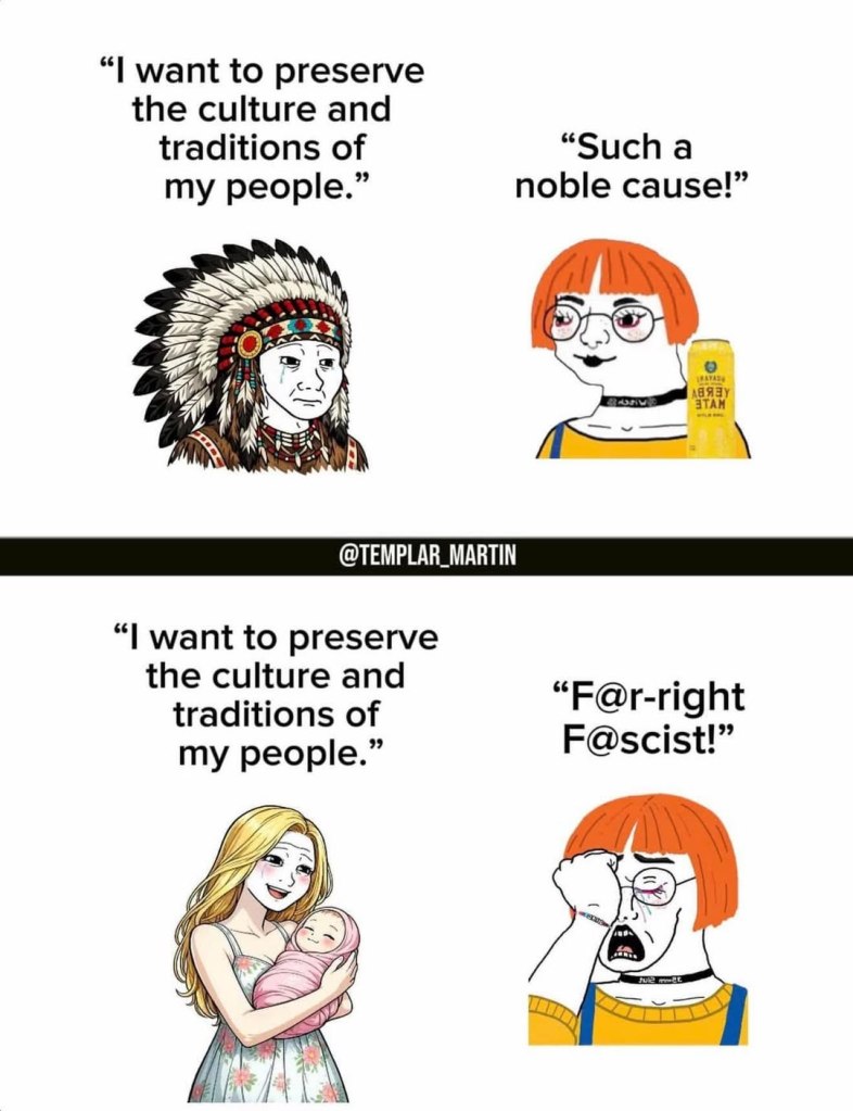 I came across a meme today that highlighted a striking double standard. On the left side of the top panel, there’s a man in a headdress essentially saying, “We just want to preserve our culture and traditions of my people.” On the right, a person with blue hair, piercings, and all the rest of it responds, “Oh, that’s so noble.” Below that, the left panel shows a white mother and her child saying the same thing as the headdress man: “We just want to preserve our culture and way of life.” But on the right, the blue-haired person replies, “Far-right fascist!”