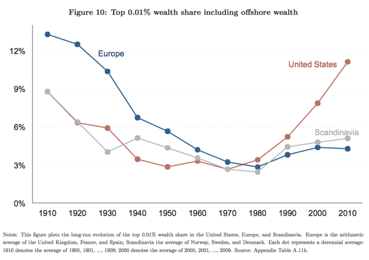 At the same time it has hammered the working class, globalization has led to a vast accumulation of wealth for a small number of families. This is especially true for the United States, but since 1980, Europe has see growing concentration of wealth among the very rich, even in Scandinavian countries. In fact, the share of wealth held by the superrich in Scandinavia is above the European average.