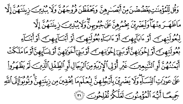 Again, using the Abdullah Yusuf Ali translation: “And say to the believing women that they should lower their gaze and guard their modesty; that they should not display their beauty and ornaments except what (must ordinarily) appear thereof; that they should draw their veils over their bosoms and not display their beauty except to their husbands, their fathers, their husband’s fathers, their sons, their husbands’ sons, their brothers or their brothers’ sons, or their sisters’ sons, or their women, or the slaves whom their right hands possess, or male servants free of physical needs, or small children who have no sense of the shame of sex; and that they should not strike their feet in order to draw attention to their hidden ornaments. And O ye Believers! turn ye all together towards Allah, that ye may attain Bliss.”