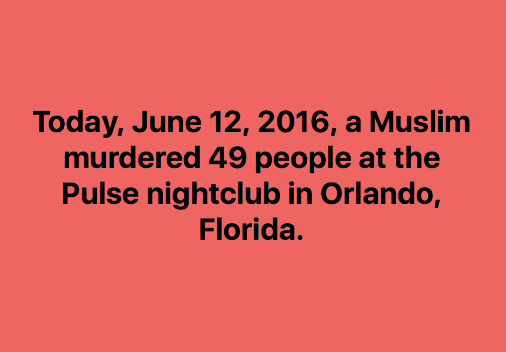 Yesterday, on my Facebook timeline, I reflected on the third anniversary of a massacre that occurred in a gay nightclub, Pulse, in Orlando, Florida, in which 49 human beings were murdered by a Muslim. My commemoration of this crime simply noted the facts: