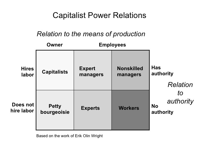 - The professional-managerial class, the most privileged group of the employee classes, which, because of investments often occupy a contradictory class location (which nonetheless benefits them), may own capital and controls labor, but does not buy labor-power.