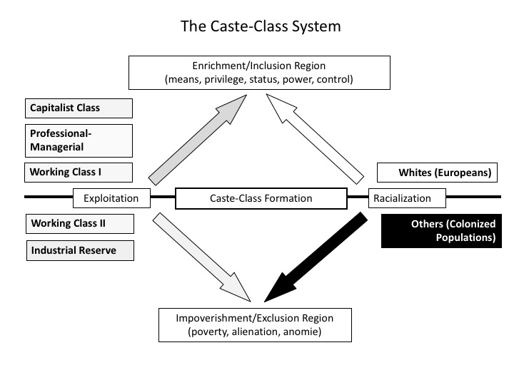 The enrichment/inclusion pattern of existence is the region of economic, political, and cultural privilege that includes capitalists, most managers, a significant portion of the petty bourgeoisie and capital and knowledge intensive workers. This region is disproportionately white, especially among the more affluent sectors. Racialization processes that code in-coming groups “white” direct racial “acceptables” into the ranks of the enriched and included. The structure becomes “whiter” or “lighter” the more we move towards the capitalist class and upper echelon of the professional-managerial class.