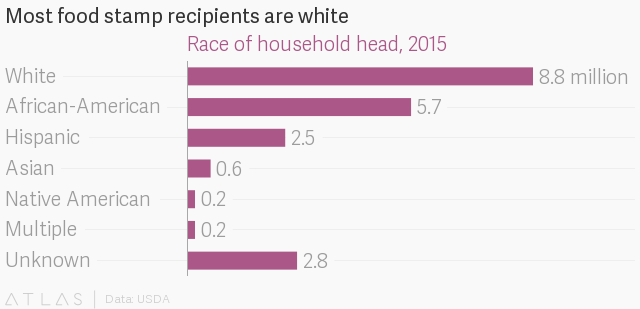 Note: Since most Hispanics are white, white recipients of food stamps exceeds 10 million persons. In other words, approximately twice as many whites use food stamps as blacks.