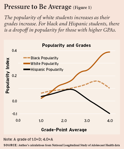 Harvard’s Ronald Fryer, in his 2006 article “Acting White,” while finding fault with the previous explanations nevertheless concludes that “the prevalence of acting white in schools with racially mixed student bodies suggests that social pressures could go a long way toward explaining the large racial and ethnic gaps in SAT scores, the underperformance of minorities in suburban schools, and the lack of adequate representation of blacks and Hispanics in elite colleges and universities.” He argues that there is a need for new identities in communities of color. “As long as distressed communities provide minorities with their identities, the social costs of breaking free will remain high” he writes. “To increase the likelihood that more can do so, society must find ways for these high achievers to thrive in settings where adverse social pressures are less intense. The integrated school, by itself, apparently cannot achieve that end.”