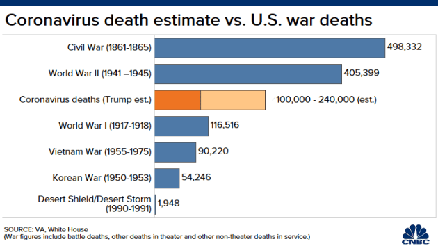 A recent CNBC headline warned: “Coronavirus could kill more Americans than WWI, Vietnam or Korean wars, White House projection shows.” We are at war. Using CDC’s material, CNBC could have reported that every year pneumonia/influenza kills roughly the same number of Americans who died in the Korean War. During the 2017-18 flu season, nearly as many Americans died from pneumonia/influenza as died in the Vietnam war (CNBC inflates the number of dead Americans from that imperialist adventure). Where are the great flu pandemics on this list? Spanish? Shanghai? Hong Kong?