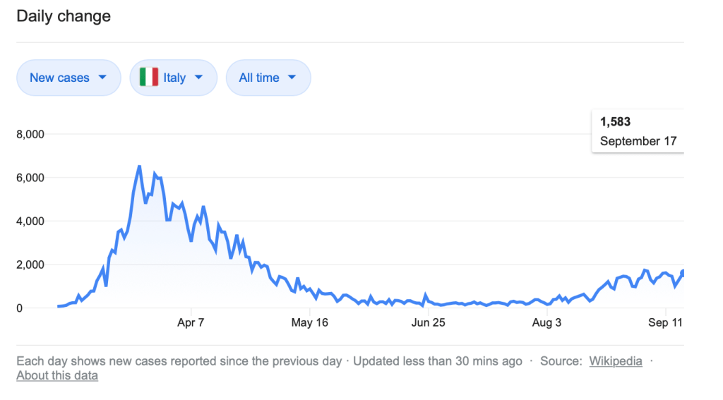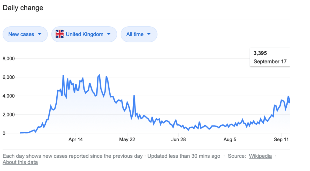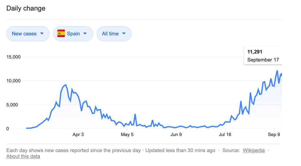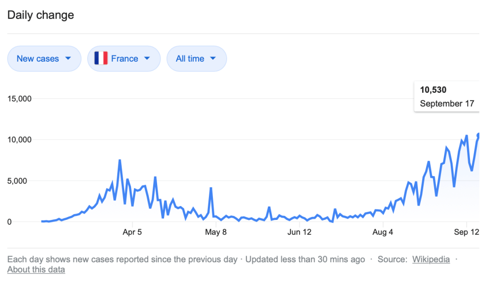 The World Health Organization is expressing concern that COVID-19 cases are rising in Europe (The new Covid-19 case surge in Europe, explained). They have declared it a “very serious situation.” The four countries I used in my comparison are among the affected nations. I present the change over time in four graphs below, obtained by searching “COVID-19 cases [country name].”
