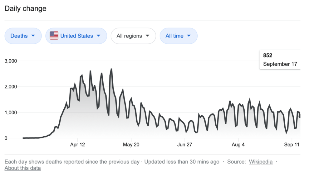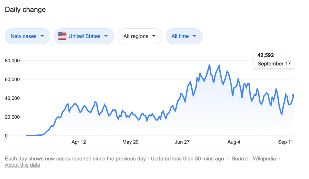 In only one country (Spain) does it appear that deaths are on the rise in any significant number, and this is the country with the greatest number of new cases. To be sure, if deaths follow, a lag in frequency is expected. Yet, in France, where a dramatic rise in cases began in mid-July, we see only a slight uptick on in the second week of September. Moreover, both Italy and the United Kingdom show very little increase in deaths despite a steady rise in cases. Perhaps this will change over time, but at present it does not appear they rise in cases is associated with increasing death.