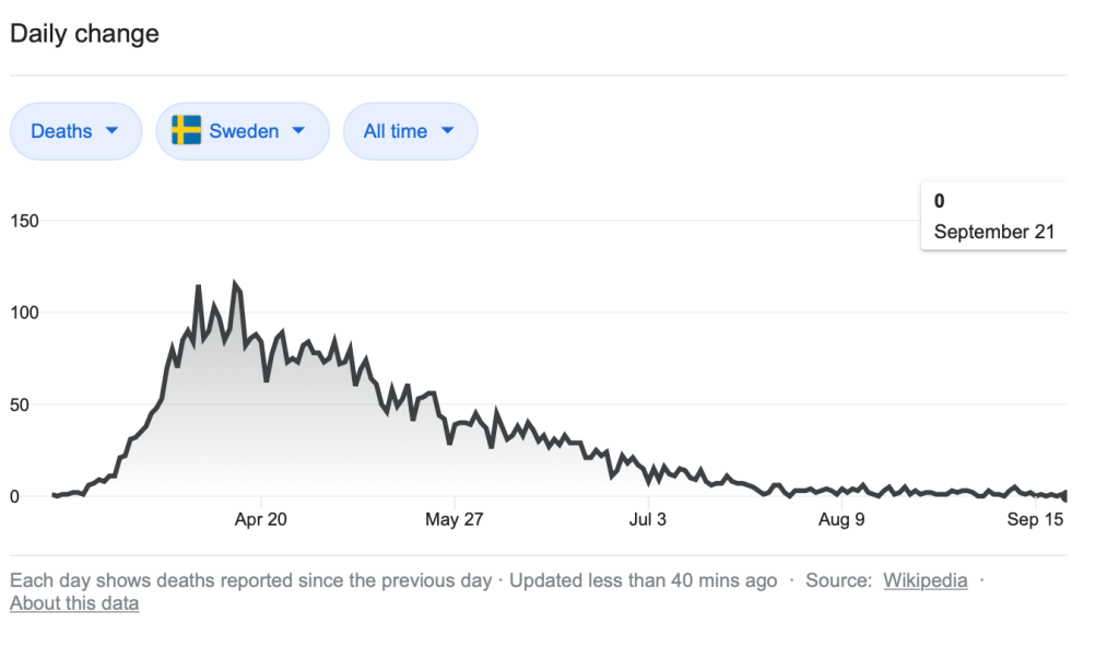Finally, a comparative point. Sweden pursued a different strategy in handling COVID-19. They sought to build herd immunity while mitigating the worst effects of the disease and thus soften its impact. As you can see by the numbers, this was a sound choice. They are not seeing the rise in cases that the other European countries cited are seeing. There almost no deaths from COVID-19 in Sweden, a diverse country of ten million people.