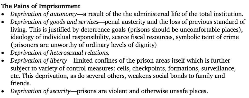 Prisonization is a species of institutionalization, specifically assimilation or integration with inmate culture, what Gresham Sykes (1958) characterizes as “a society of captives.” It’s Sykes’ catalog of the “pains of imprisonment” that informs the conceptual model used in this paper. Sykes identifies five deprivations underpinning inmate adaptation to prison life, deprivations of autonomy, goods and services, heterosexual relationships, liberty, and security. This is commonly known as the “deprivation thesis.” Those things prison deprives are understood as human needs that inmate culture ameliorates, corrupts, or serves.