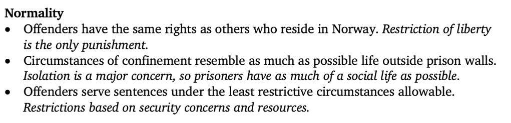 A big piece of understanding the Norwegian system is understanding what Norway calls the “principle of normality.” The normality principle limits punishment to restriction of liberty only. No other rights are explicitly compromised by the sentencing court. Punishments are designed so that no one will exist in stricter circumstances than necessary for the sake of the community, a principle that emphasizes placement in the lowest possible security regimes. Life inside prison is to resemble, as much as possible, life outside prison.