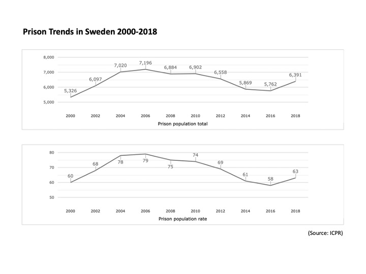 According to the same source, inmates in Swedish correctional facilities in 2020 numbered around 7,000 in 79 correctional institutions, with a rate of 68 per 100,000 (see chart below). Just over six percent are women. Just over 22.1 percent are foreign born. Recidivism rates, at around 40 percent within three years, are lower in Sweden than in the United States but considerably higher than in Norway. Sweden’s correctional system is 101.6 percent capacity.