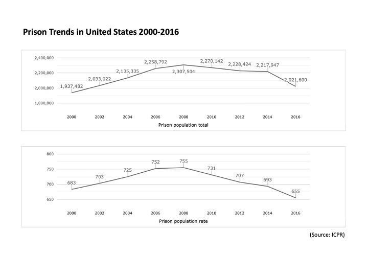 Reduction in the size of the penitentiary in the United States is a function of historically low rates of crime and especially violence in the United States. The country has seen significant reforms over the last few years, but we likely won’t see the results of that, all things being equal, for a few years now. Why crime has fallen is beyond the scope of my talk today.