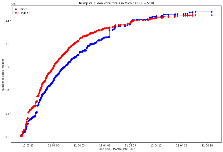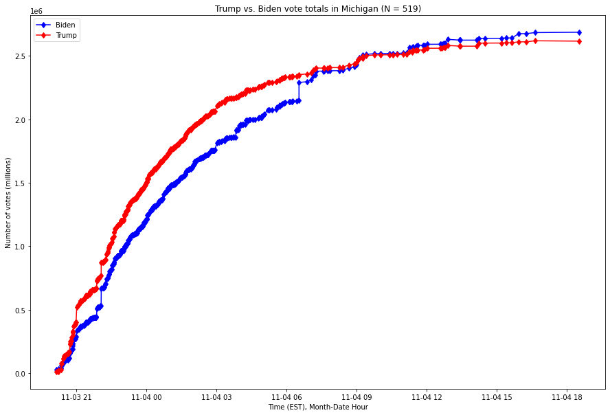 We see in multiple states a massive flip of votes of similar proportions occurring at similar times. In two states, the flip occurs within seconds. See the study Anomalies in Vote Counts and Their Effects on Election 2020. Note the time stamps. There is a near simultaneous uptick (see X axis) of similar magnitude (see Y axis). See also the study Michigan 2020 Voting Analysis Report.