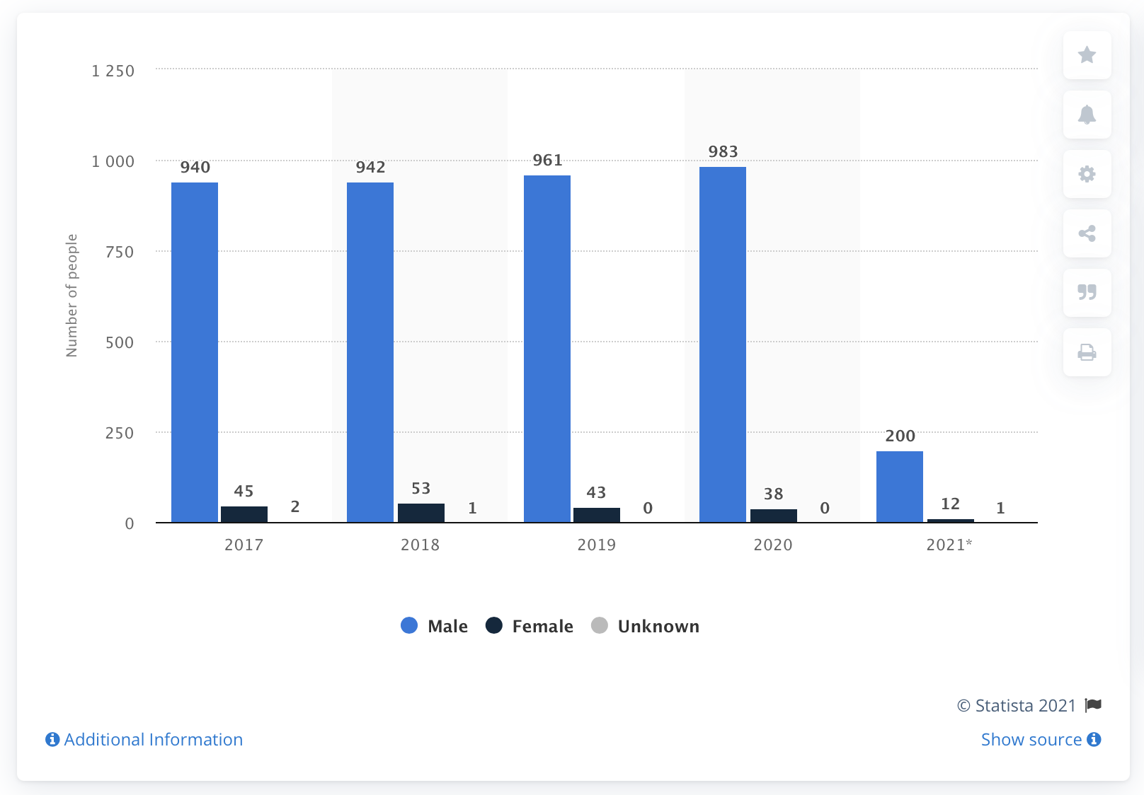 Do I even need to explain this? Here we go, anyway: Male overrepresentation in serious crime relative to women and this overrepresentation causes men to interact with police more frequently than women and, as result, the risk of a lethal encounter with police officers is greater for men than women.