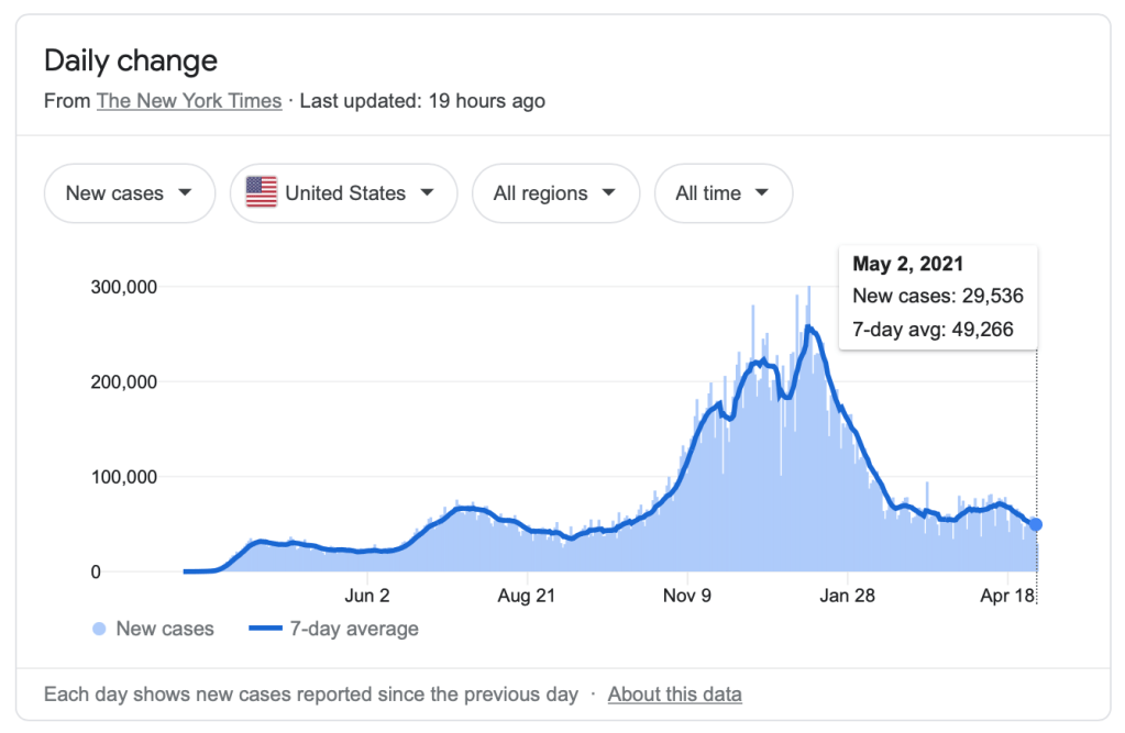 First, it isn’t a particularly dangerous time to be unvaccinated. New cases have fallen to levels last seen nearly a year ago when the Democrats were encouraging people to mass gather and promote the project to depolice America’s most dangerous communities. Moreover, half the population has now received at least one dose of the vaccine. If the vaccines are as efficacious as health officials are asserting, combined with the more than thirty million of those who have already been confirmed to have been or are currently infected, an undercount given an unreckoned but no doubt large number unconfirmed infections, we are at or around typical levels of herd immunity.