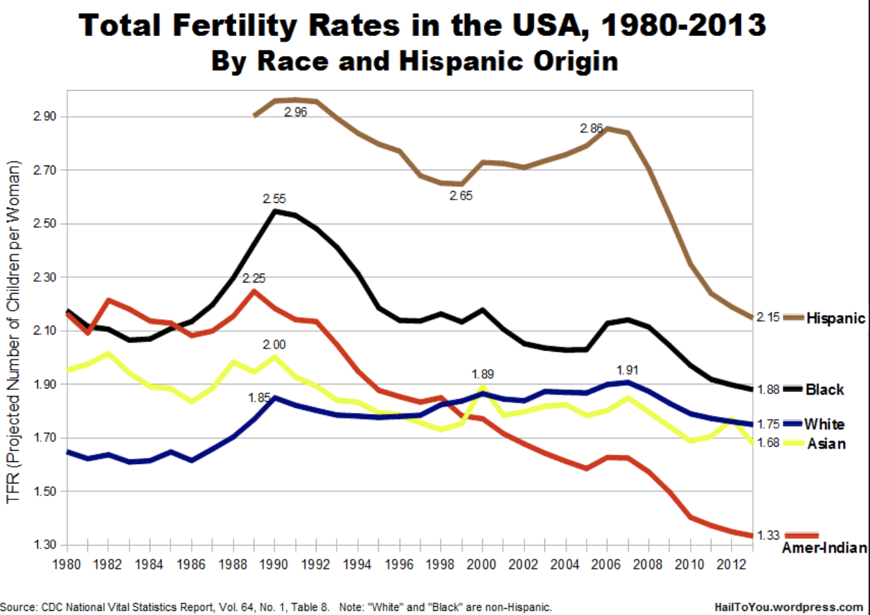 To return to the question of population, over which the Vox piece frets, what is especially disturbing about the advocacy of family planning at home is the fact that its most aggressive when it comes to poor and disproportionately native black and brown demographics. Whereas, since the late 1970s, white fertility has stabilized (and even increased—and is projected to grow in the coming decades), nonwhite fertility has declined rather drastically. This is why the accusation of racism behind the concern expressed by the replacement thesis misses the mark (it’s propaganda)—to wit, those being replaced are black and brown workers. (See “The ‘Great Replacement’ as Antiracist Propaganda.”)