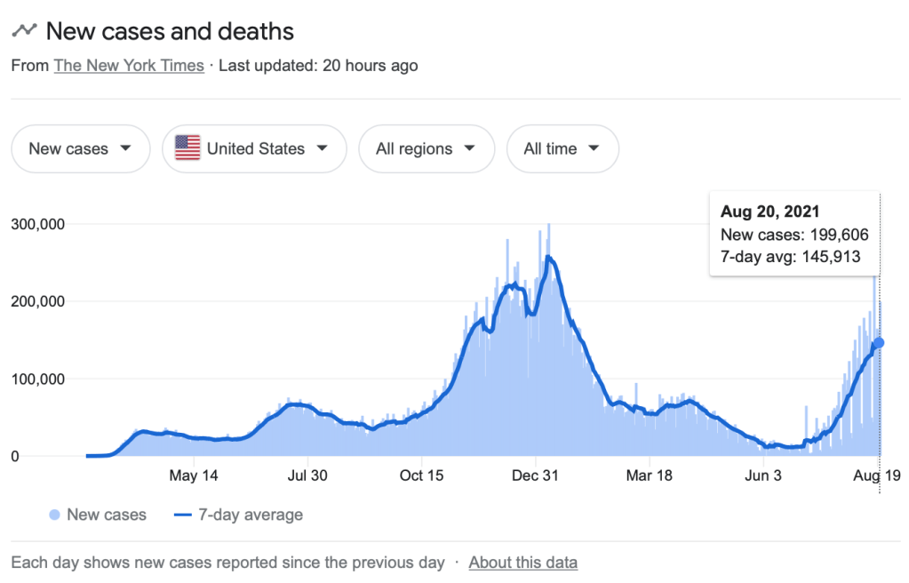 That these trends are occurring during the summer months is alarming. If you look at the trends in the first chart, last year’s cases went down during late July and August. They didn’t start significantly rising again until late October. Moreover, the numbers then were nowhere near the numbers they are presently at any time prior to peaks experienced during the fall and early winter 2020-21 when viruses usually prove most devastating due to cold weather and confined social spaces.