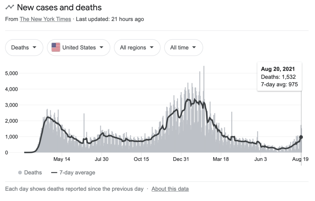 Looking at the chart, it appears, as I warned only a few days ago, that the progress the nation made prior to widespread vaccination, when it appeared we had reacher herd immunity, has been erased with the introduction of the vaccines. I am not necessarily saying this rise is mostly due to vaccines. But you might consider that possibility. The media won’t. And now deaths are rising, too (see chart below). Thankfully the case fatality rate is down, which is likely the result of the expected evolutionary path viruses take to become less lethal and thus more communicable, a path again very likely helped by those healthy enough to socially engage with others.