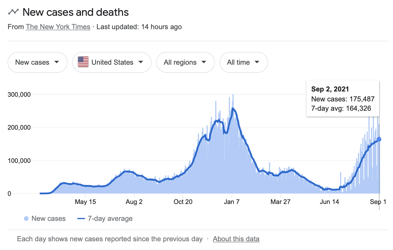 There are some other useful conclusions to draw from what industrial hygienists are teaching us. First, most people have been exposed to this virus repeatedly but not everybody who is exposed gets sick. Why? It is likely that, since most of us have had coronavirus infections throughout our lives, we already enjoy some immunity from it. As I have explained on Freedom and Reason, coronaviruses are among the several viruses that causes the common cold (rhinoviruses and adenoviruses are other common cold pathogens). This means the R0 associated with SARS-CoV-2 is low compared to, say, the R0 with measles. I am not choosing the most extreme R0 to make the comparison. Anthony Fauci is the man who argues that SARS-CoV-2 is so contagious that we need to reach the same vaccine coverage as measles (around 95 percent) to reach herd immunity. SARS-CoV-2 is more in the R0 range of the flu. That means that, if these vaccines work, a big if, we surpassed herd immunity by virtue of the numbers vaccinated so far, approaching 55 percent for fully vaccination, with more than 60 percent having received at least one shot, which expects tell us has a significant degree of efficacy. But the vaccines are leaky, which means that they don’t prevent infection. The likely reason why we are back where we were during the peak (see chart below) is leaky vaccines that keep the vaccinated healthy enough to get out in the world and spread the virus and, moreover, keep the more sickening strains from being victims of natural selection.