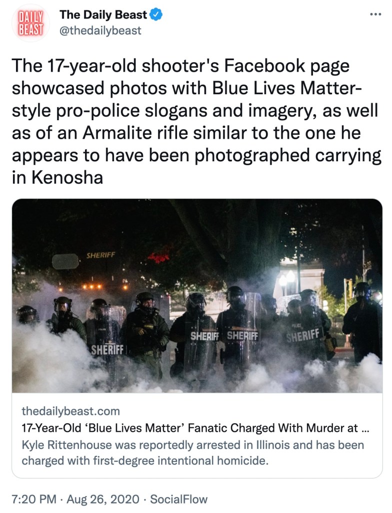 “Make no mistake,” Watson opines, without the benefit of supporting evidence, “the shooting of Jacob Blake and the related protests and fatalities stem from the deep-seated white supremacy that pervades our criminal legal system.” Aware that there is no evidence supporting the claim, Watson appeals to a false historical narrative “that recalls the origin of American police in slave patrols” (see The Line from Slave Patrols to Modern Policing and Other Myths). “These patrols sought to capture and return formerly enslaved people to the violence of enslavement and their later connections to white supremacist agitation during the Civil Rights movement are echoed in the violence seen in Kenosha.” Whether true or not, what does this have to do with Kenosha? According to the ACLU, contrary to what it known about the night, “white people brandishing weapons of war are given the benefit of the doubt and even encouraged by officers of those same police agencies.” This is what The Daily Beast sees in Blue Lives Matter imagery and Armalite rifles. They need only to see a young white man who believes in the rule of law to fill in the rest. This is the logic of identity politics. It’s not what you do. It’s who you are.