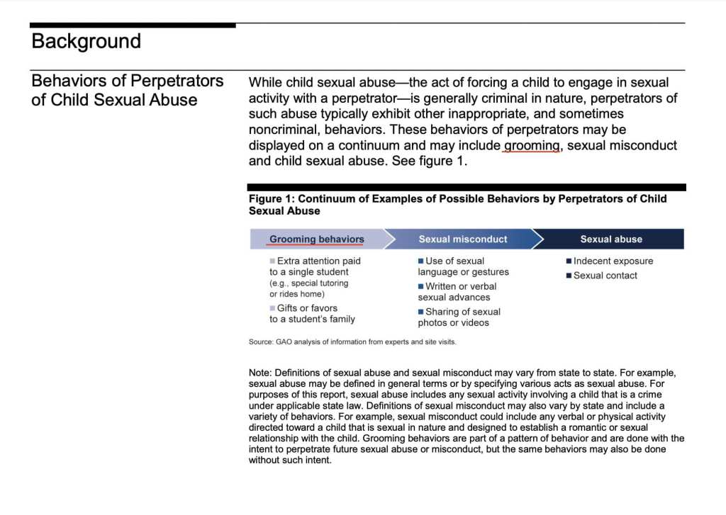 Update (April 9, 2022 h/t Christopher Rufo): In January 2014, the GAO published a report, “Federal Agencies Can Better Support State Efforts to Prevent and Respond to Sexual Abuse by School Personnel,” warning about child predators in public schools. The report advised administrators to monitor teachers for grooming behaviors that could lead to sexual misconduct and sexual abuse. Note the signs of grooming behavior. Note also what constitutes misconduct and abuse. Sexually explicit items, pamphlets, books, and videos are among the signs.