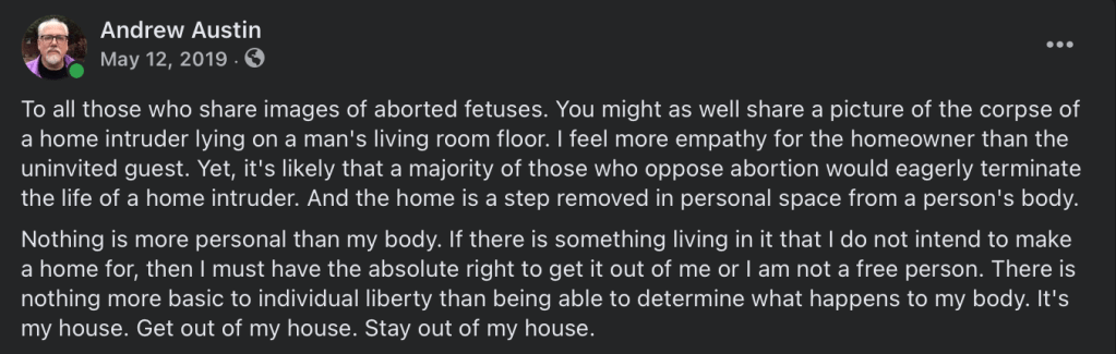 I don’t want to hear conservatives talk about individual liberty if they’re not prepared to defend the clearest instantiation of it. If you support restricting abortion, then your liberty talk is in bad faith. Spare us your hypocrisy.