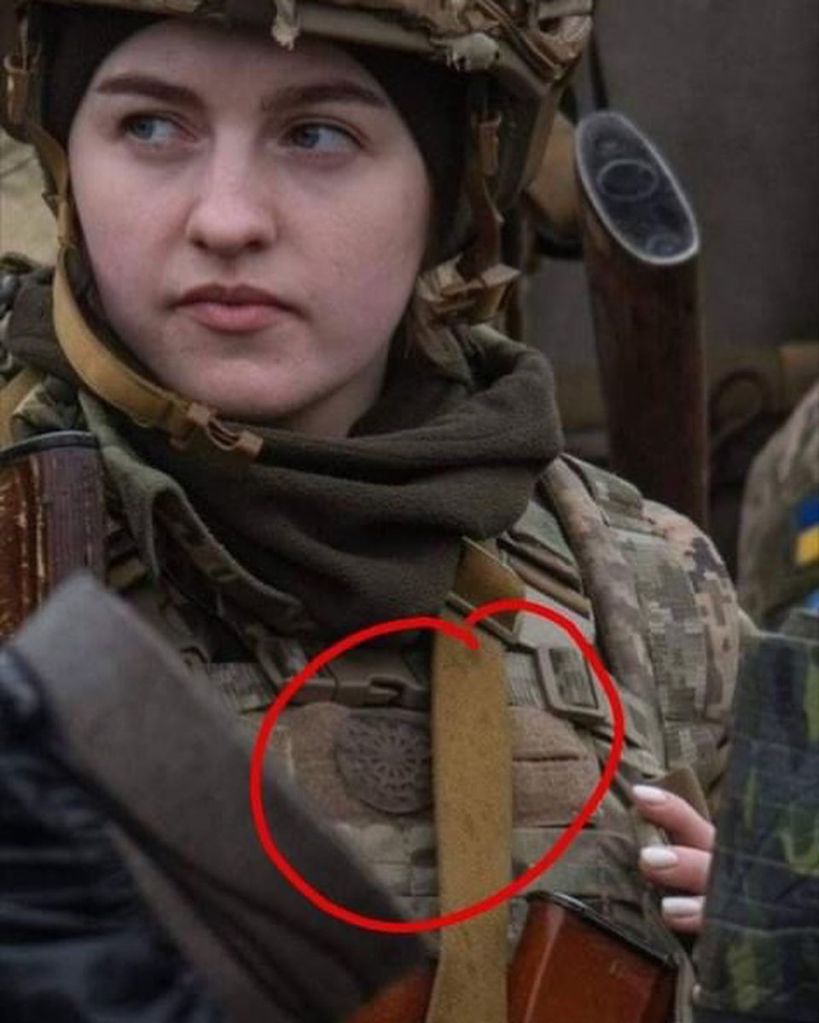 Organized frenzy is very often subterfuge. Could this frame be concealing something more than the managed decline of the West? Are there other forces at work here that “normalize hate” and “embolden violent extremists”? Go back and look at the symbol on his Gendron’s vest. It’s a type of sunwheel (sonnenrad in German) called the Black Sun (Schwarze Sonne). It’s a Nazis symbol popular among Eastern European neo-Nazi groups. It was used, for example, as the insignia of the Banderists, fascists who collaborated with the Nazis during WWII. Below is a photo of a Ukrainian soldier wearing the symbol. The photo, which I have shared before, is war propaganda tweeted by NATO leveraging International Women’s Day to promote the righteousness of the Ukrainian military. The popular Ukrainian president Zelensky’s slogan “Glory to Ukraine, Glory to the Heroes” is the same slogan as that of the wartime fascists in Ukraine. The current government has adopted the slogan as the country’s national motto. (See The US is Not Provoking Russia—And Other Tall Tales.)