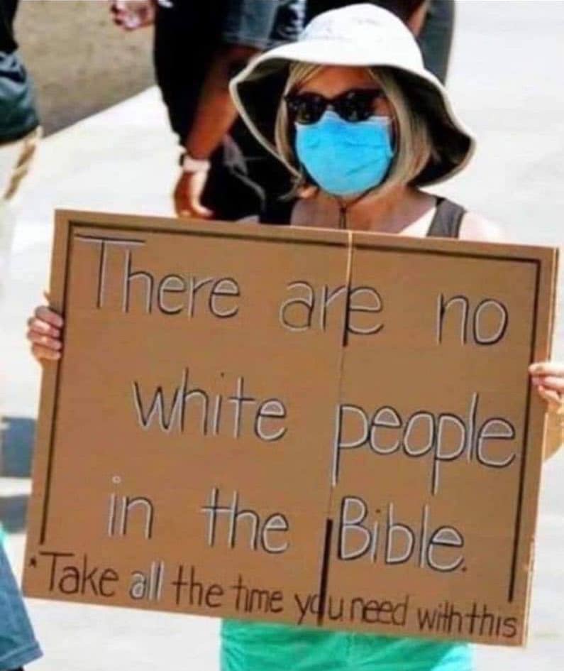 I have in-depth writings about this in Freedom and Reason, so I am directing readers to the following blogs rather that repeat those points here: Race, Ethnicity, Religion, and the Problem of Conceptual Conflation and Inflation and Casual Conflation of Categories. But I want to emphasis the color scheme appearing in the parentheticals does not refer to the actual neutrals and the color yellow. I am fully aware that “yellow” is offensive to many of East Asian descent, just as “red” is offensive to many American Indians, and my intent is not to offend. I don’t like this scheme. Nobody is actually black, yellow, or white (or red). The color schemes is shorthand for the constellation of superficial traits. I don’t believe in race. But clearly the woman holding the sign believes in it, since she is presuming the characters of the Bible belong to one or many—none of which are white.