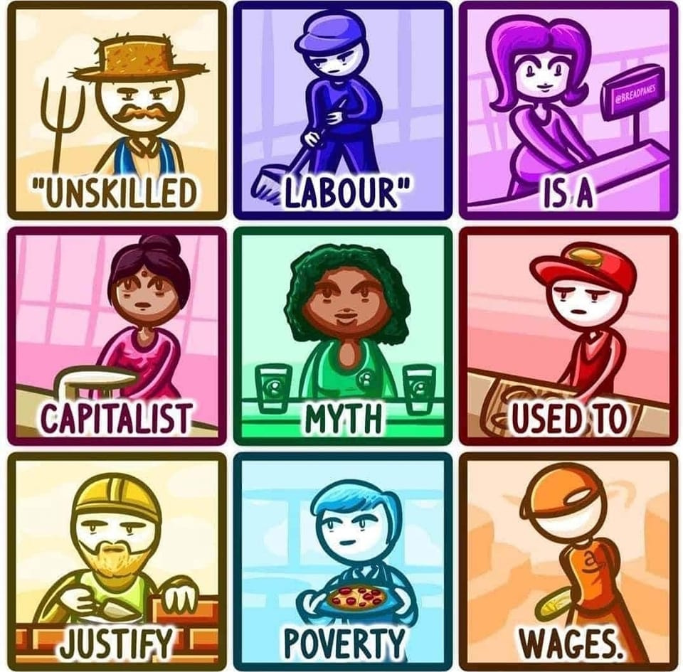 The meme obscures an essential point about unskilled labor. Unskilled labor exists as the result of industrial capitalism deskilling labor via breaking up the production process, deploying automation and mechanization, and the imposition of scientific management, i.e., Fordism and Taylorism. For example, weaving used to be a skill. With the advent of the power loom, the “weaver” only needed to clear the shuttle when it jammed, or manage other simple tasks, tasks that a five-year-old could do—and often did. Building a car used to be a skill, but Ford fixed it so a person had to put a nut on a bolt as the automobile rolled by. Etcetera.