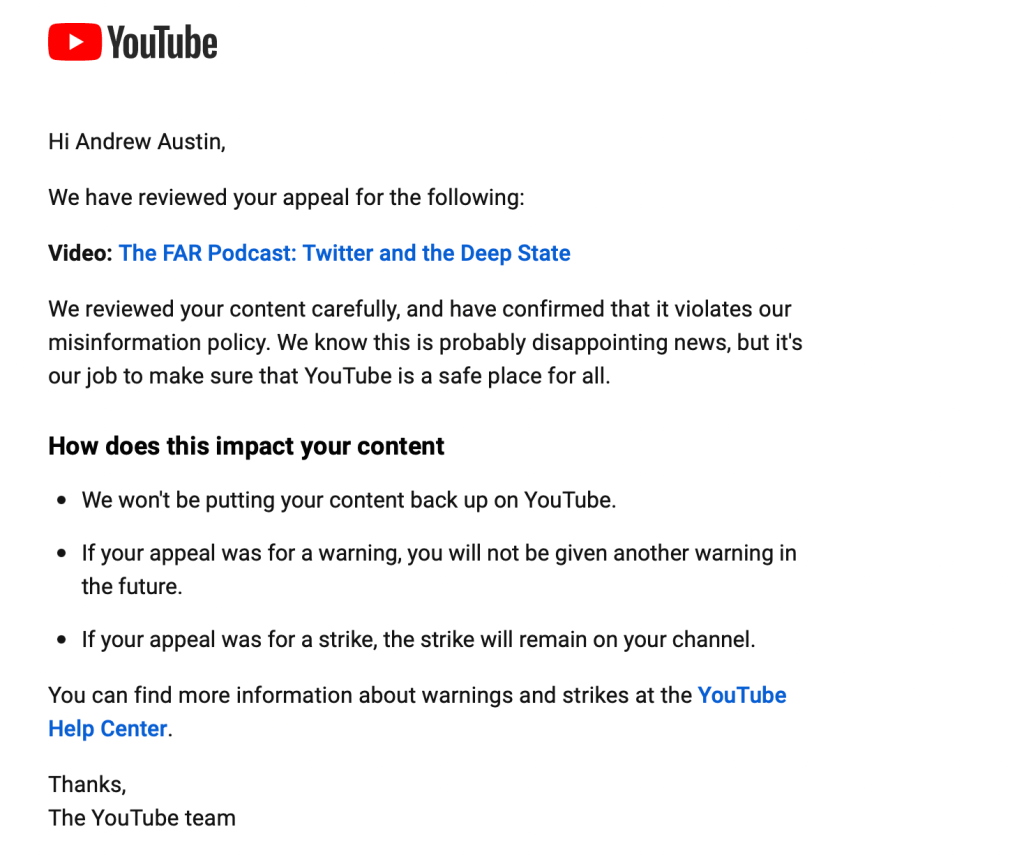 I was finally provided a link to appeal YouTube’s decision to ban my podcast “Twitter and the Deep State.”  Soon after submitting my appeal, YouTube got back to me this this:
