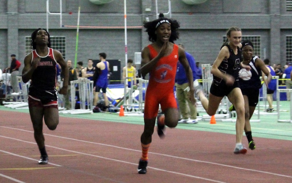 Bloomfield High School athletes Terry Miller, second from left, and Andraya Yearwood, far left, compete in the 55-meter dash at the Connecticut girls Class S indoor track meet in New Haven, February 2019. (AP Photo)