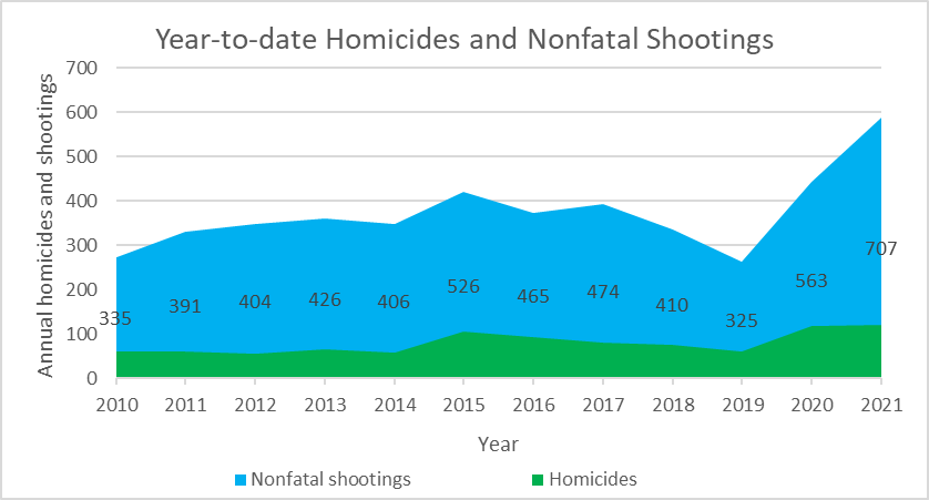 Hot off the press. Milwaukee has shattered its homicide record for a third year in a row. Murder there is growing exponentially. In 2019, the city reported 97 homicides. As 2022 draws to a close, the city has recorded 214 people murdered—in a single year. (The below chart reflects statistics through 2021. I do not yet have the number for nonfatal shootings.)