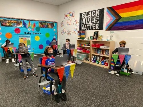 There should be no flags or signs in public school classroom expressing faith belief or ideological systems. No pictures of Jesus. No Black Lives Matter slogans. No gender ideology flags. School administrators should remove all these signs of faith belief from the classroom.