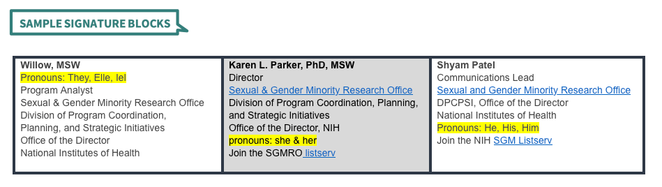 “Encouraging the disclosure and use of gender pronouns can create inclusive and welcoming work environments for SGM employees and their allies,” the NIH document states.