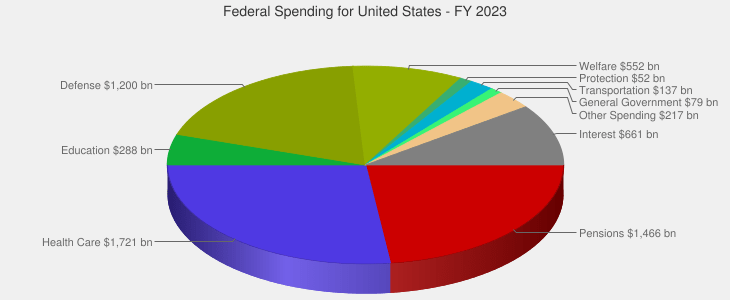 According to a fact sheet distributed by the House GOP, non-defense discretionary spending would be rolled back to fiscal year 2022 levels, with federal spending limited to one percent annual growth for the next six years (in the bill passed by the House the limit on annual growth in spending extended to a decade, with defense spending again excluded). The breakdown of non-defense discretionary spending for fiscal year 2024 would be approximately $704 billion. Out of this amount, $121 billion would be allocated for veterans’ medical care, and $583 billion for other areas. According to the bill’s text, $886 billion would be allocated to defense spending. In other words, retirement benefits excluded, more than a trillion dollars will be spent on the military and its liabilities annually.