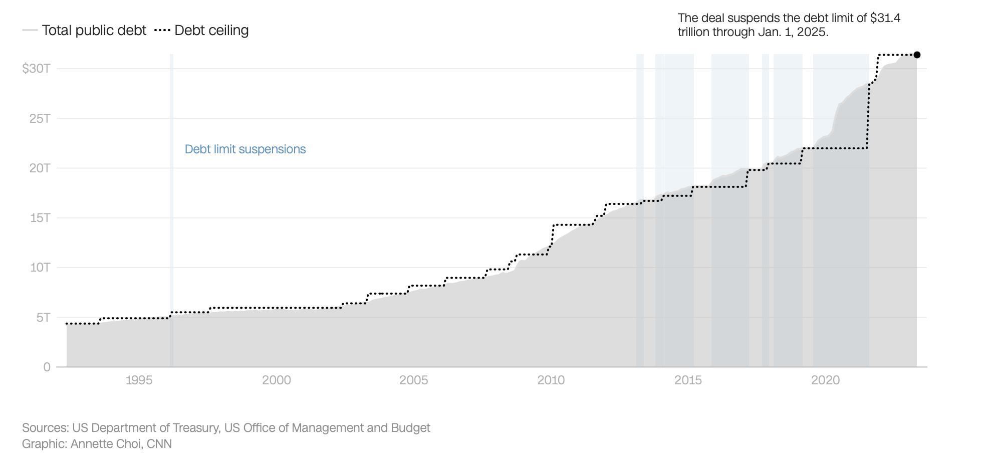 Yesterday, the text of the bill made public on Sunday evening, the House voted on a deal negotiated by the White House and House Republicans that would suspend the nation’s borrowing cap until January 2025, enabling the debt to grow beyond the ceiling. The bill imposes a cap on non-defense discretionary spending, which covers areas such as public education and transportation, for fiscal year 2024, removing the debt limit as a potential issue in the 2024 presidential election (evidence of establishment influence on Republican Party leadership). The deal allows for a one percent increase in 2025. After fiscal year 2025, there would be no budget caps.