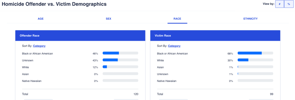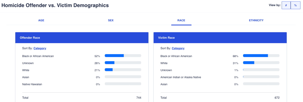 There were 327 homicides in Memphis recorded by the Memphis Police Department in 2021. Of these, 64 percent of homicides were perpetrated by blacks, whereas only 5 percent of homicides were perpetrated by whites, with the race unknown for 31 percent of perpetrators. Again, with 88 percent of homicide victims being black, the “race unknown” category is almost certainly mostly black. Memphis has a population of 621,056, 64 percent of which is black.