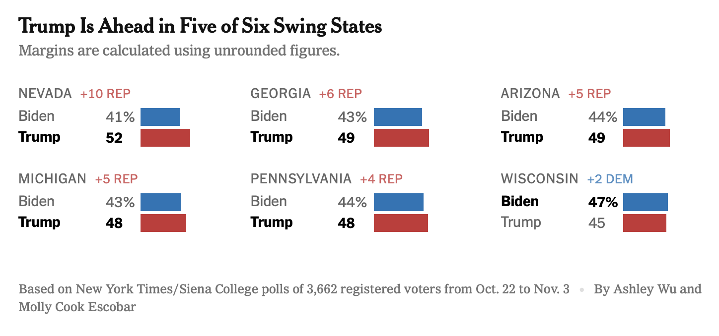 “Trump Leads in 5 Critical States as Voters Blast Biden, Times/Siena Poll Finds,” reads The New York Times November 5 headline. The subtitle: “Voters in battleground states said they trusted Donald J. Trump over President Biden on the economy, foreign policy and immigration, as Mr. Biden’s multiracial base shows signs of fraying.” The article states, “The results show Mr. Biden losing to Mr. Trump, his likeliest Republican rival, by margins of three to 10 percentage points among registered voters in Arizona, Georgia, Michigan, Nevada and Pennsylvania. Mr. Biden is ahead only in Wisconsin, by two percentage points, the poll found.” (Note the NYTimes’ use of Trump’s MAGA name: Donald J. Trump. Is this mocking?)
