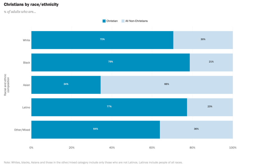 But the ignorance of Western youth doesn’t end there. What about the hundreds of millions of non-whites counted among the 2.4 billion Christians in the world? Christianity is far and away the largest religious faith in the world, its congregation represent a third of all humans on the planet. Christians outnumber Muslims globally by several hundred million people—people of all races and ethnicities found throughout the world. There are tens of millions of Christians in sub-Saharan Africa. Most black Americans are Christian (nearly 80 percent). The brown people of Central and South America (albeit still caucasian) are Christian. And there is an untold number of Chinese Christians not counted because the totalitarian People’s Republic of China won’t allow them to freely practice or acknowledge the extent of their existence.