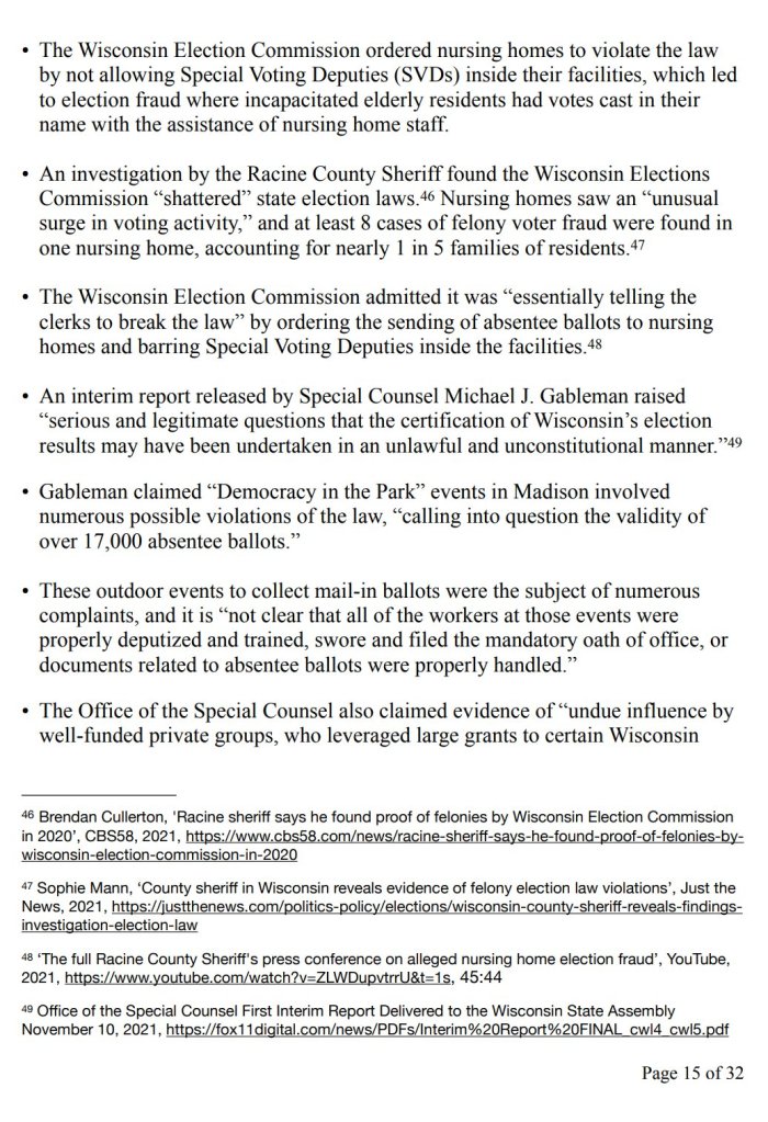 • The special counsel said it possessed evidence of nursing home facility staff and directors who “assisted residents in completing ballots; assisted residents in obtaining absentee ballots; pressured residents to vote; collected completed ballots from residents; forged signatures of residents; illegally returned residents’ ballots to the municipal clerks by mail, by placing the ballots in drop boxes, and/ or delivering them directly to the clerks; pressured and/or assisted incompetent persons to complete and cast ballots in the November 2020 election, up to and including persons who have had their right to vote take away by court order due to mental incompetence.”