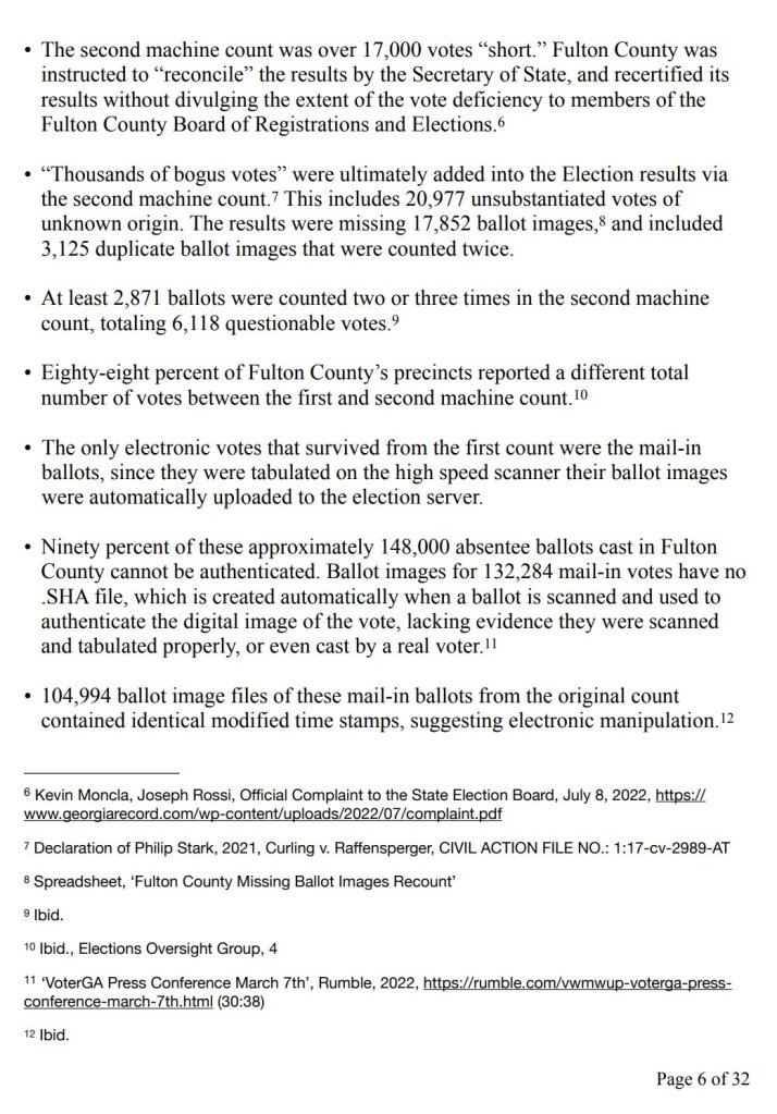Getting to this result in Georgia, and other states, created an irredeemably compromised Election, filled with violations of the Constitution, unlawful ballots, widespread broken chain of custody, electronic manipulation, and missing and corrupted election files that made it uncertifiable—and impossible to recreate the results.