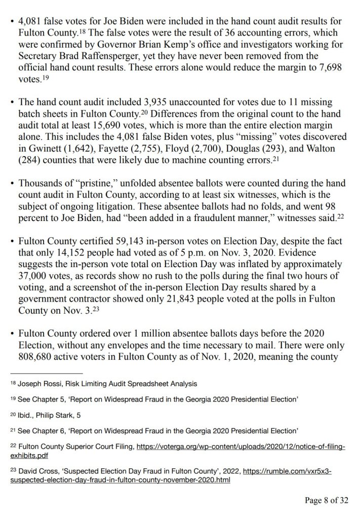 • 4,081 false votes for Joe Biden were included in the hand count audit results for Fulton County. The false votes were the result of 36 accounting errors, which were confirmed by Governor Brian Kemp’s office and investigators working for Secretary Brad Raffensperger, yet they have never been removed from the official hand count results. These errors alone would reduce the margin to 7,698 votes.
