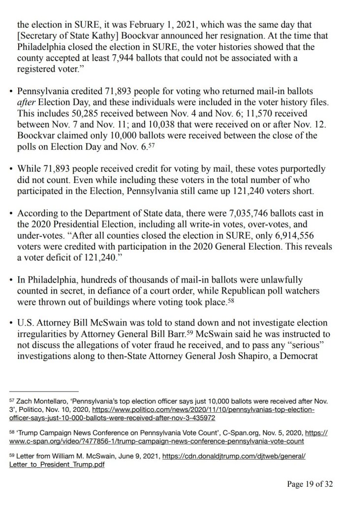 • Months after the election, there were 121,240 more votes than voters, according to the Pennsylvania Department of State. By law, Pennsylvania cannot certify an election with this type of discrepancy.