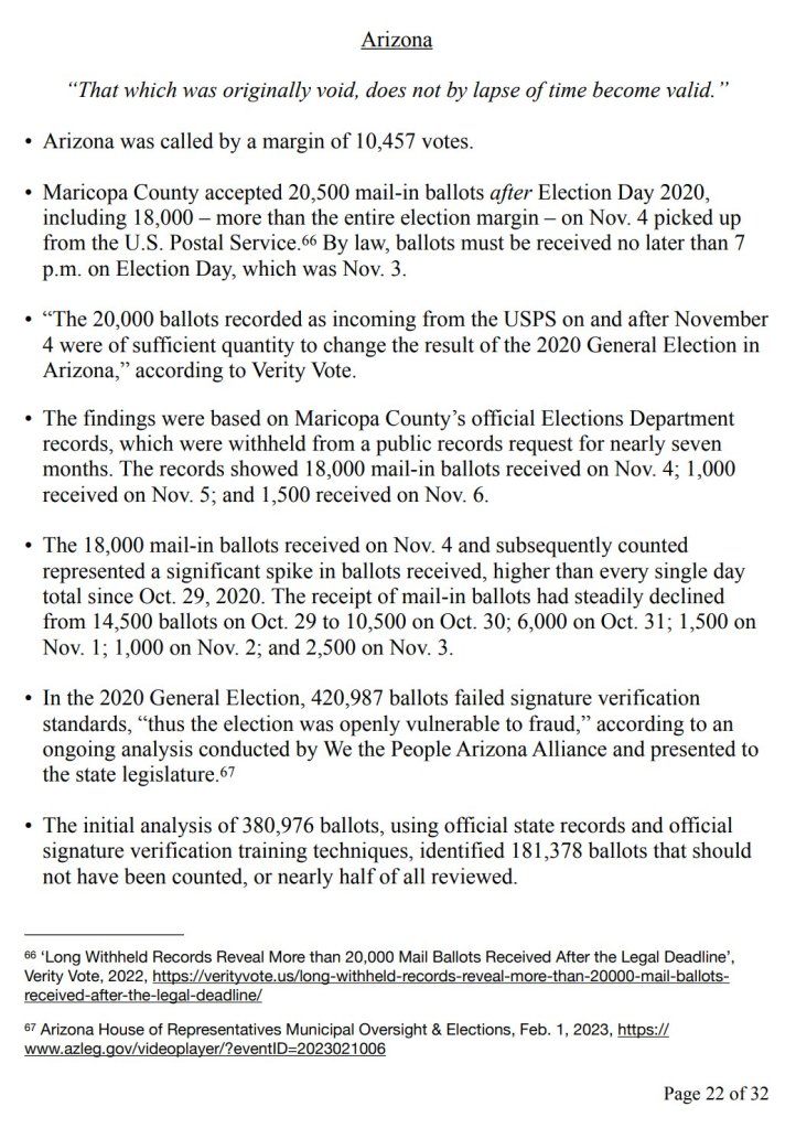 • “The 20,000 ballots recorded as incoming from the USPS on and after November 4 were of sufficient quantity to change the result of the 2020 General Election in Arizona,” according to Verity Vote.