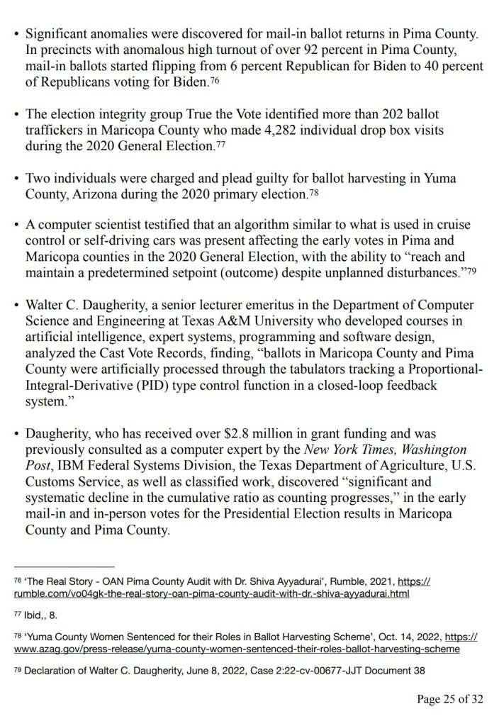 • A computer scientist testified that an algorithm similar to what is used in cruise control or self-driving cars was present affecting the early votes in Pima and Maricopa counties in the 2020 General Election, with the ability to “reach and maintain a predetermined setpoint (outcome) despite unplanned disturbances.”
