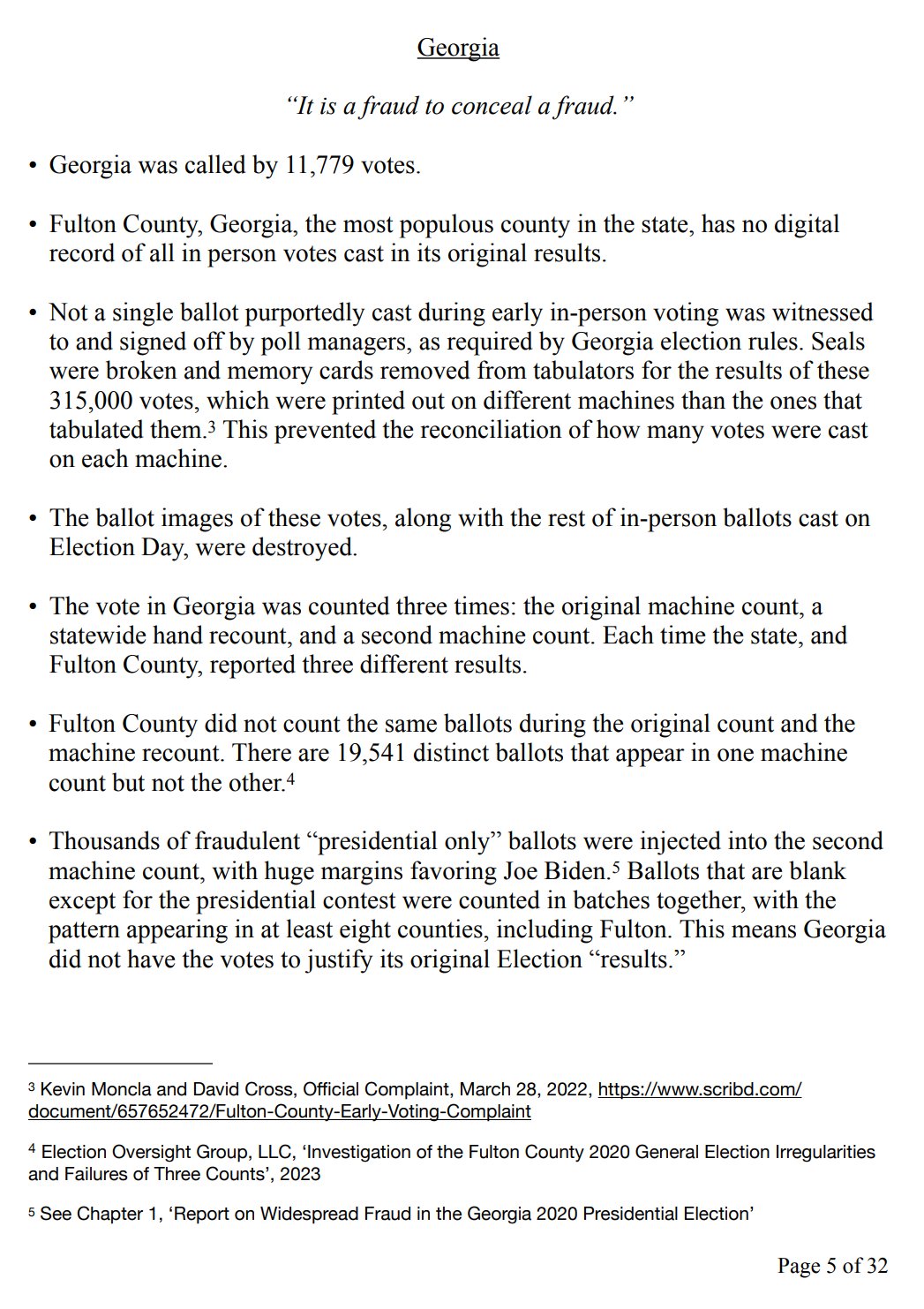 What follows is a summary of election fraud in five swing states in the 2020 Presidential Election. The states are Georgia, Wisconsin, Pennsylvania, Arizona, and Michigan. This information comes from the Trump campaign (here’s the source document). I’m not going to put this in my own words, but rather will share images from the document Kanekoa the Great’s text extractions, which I am lifting from his X (Twitter) feed, links to which I will share above each section. There are many ways to view this material; I want to post it here for posterity and because I get asked all the time whether I think the 2020 presidential election was stolen.