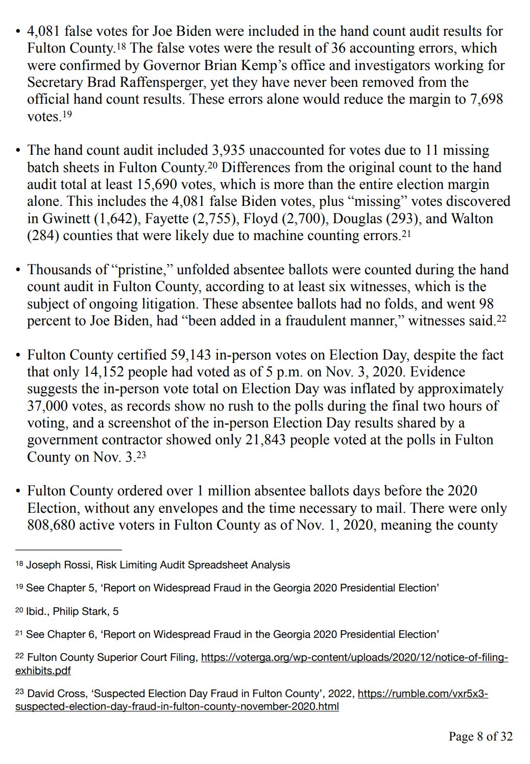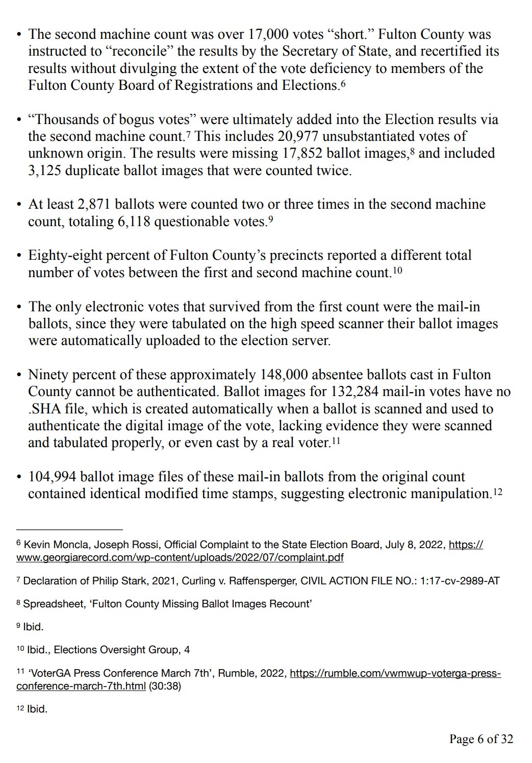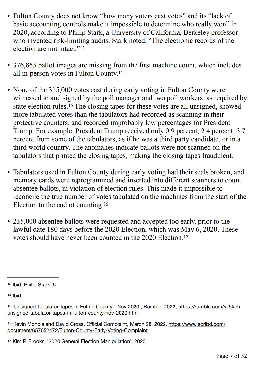 • Fulton County does not know “how many voters cast votes” and its “lack of basic accounting controls make it impossible to determine who really won” in 2020, according to Philip Stark, a University of California, Berkeley professor who invented risk-limiting audits. Stark noted, “The electronic records of the election are not intact.”