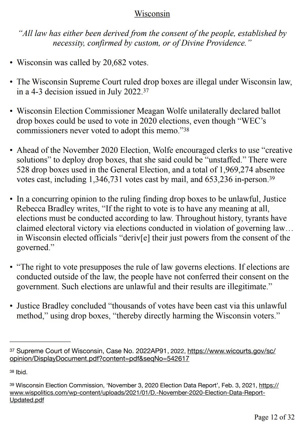 • In a concurring opinion to the ruling finding drop boxes to be unlawful, Justice Rebecca Bradley writes, “If the right to vote is to have any meaning at all, elections must be conducted according to law. Throughout history, tyrants have claimed electoral victory via elections conducted in violation of governing law… in Wisconsin elected officials “deriv[e] their just powers from the consent of the governed.”