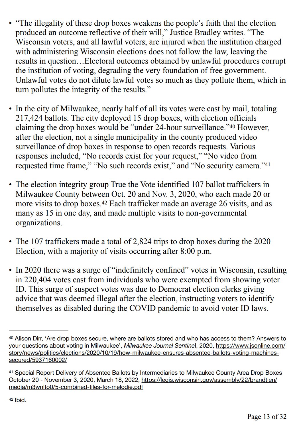 • Justice Bradley concluded “thousands of votes have been cast via this unlawful method,” using drop boxes, “thereby directly harming the Wisconsin voters.”