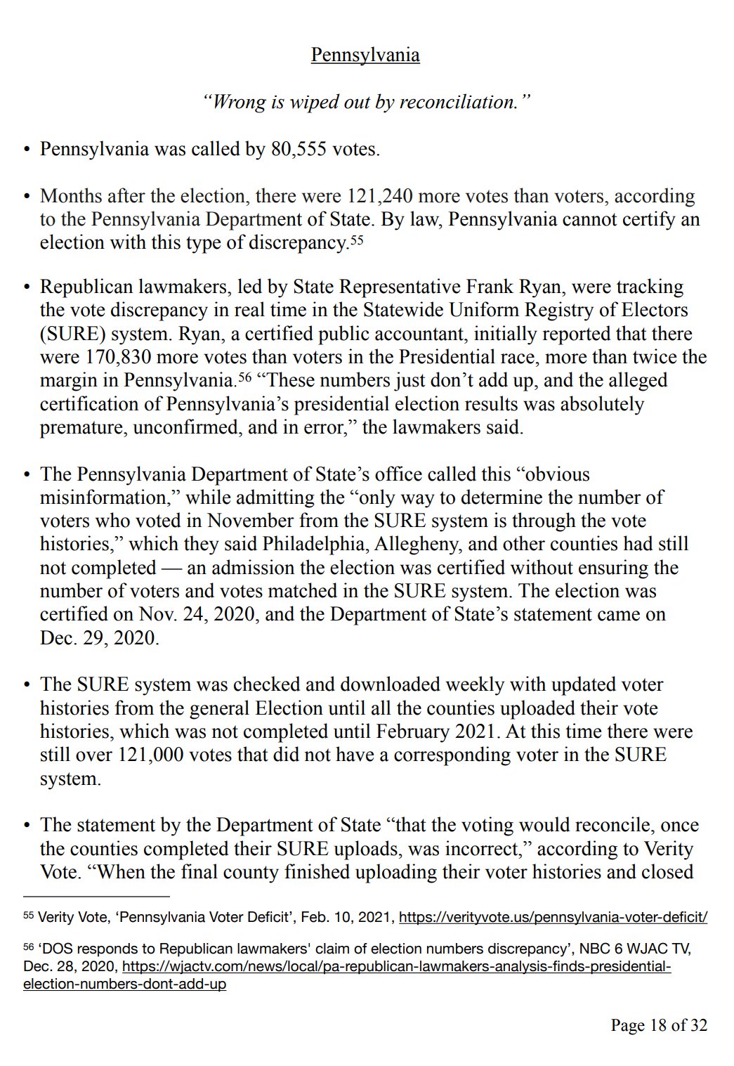 • Months after the election, there were 121,240 more votes than voters, according to the Pennsylvania Department of State. By law, Pennsylvania cannot certify an election with this type of discrepancy.